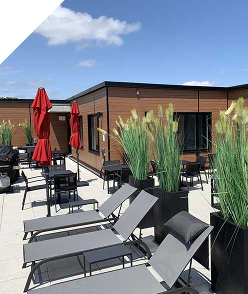 L’immeuble comporte une terrasse au toit, une salle d’entraînement, une salle commune, et un stationnement intérieur.